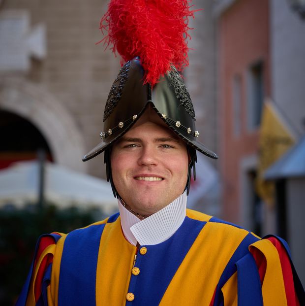 In der traditionellen Renaissance-Uniform steckt ein junger, moderner und gut ausgebildeter Schweizer. Mit dem Reisläufer des 16. Jahrhunderts verbindet ihn auch heute noch die feste Überzeugung, dass die Kirche Jesu Christi und der Nachfolger Petri es verdienen, dass man sich für sie, wenn nötig gar mit seinem eigenen Leben, einsetzt. Und es verbindet ihn noch immer eine gewisse Abenteuerlust auf das internationale Umfeld, die Kameradschaft, das Kennenlernen des Sicherheitsmetiers und darauf, den eigenen Glauben tiefer zu erfahren, eine neue Sprache zu erlernen und die Kultur Italiens zu erleben. In diesem mediterranen Klima reifen nicht nur süsse Früchte, sondern auch Glaube, Überzeugung, Können, Freundschaft und Lebensfreude.